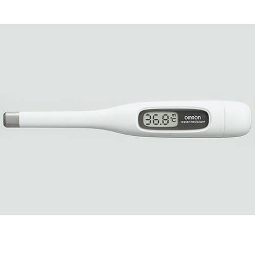 水で丸洗いできて清潔な、防水タイプ。先端が平らな形状になった、オムロン独自のフラットセンサを感温部に採用で、わきの下や舌下にしっかりフィットします。