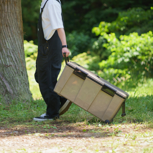 たっぷり収納できる大型クーラーボックス。両開きの小フタで冷気を逃しにくく、収納物の出し入れが可能です。水抜き栓付き。ペットボトル収納目安:1.5L17本または2L12本。