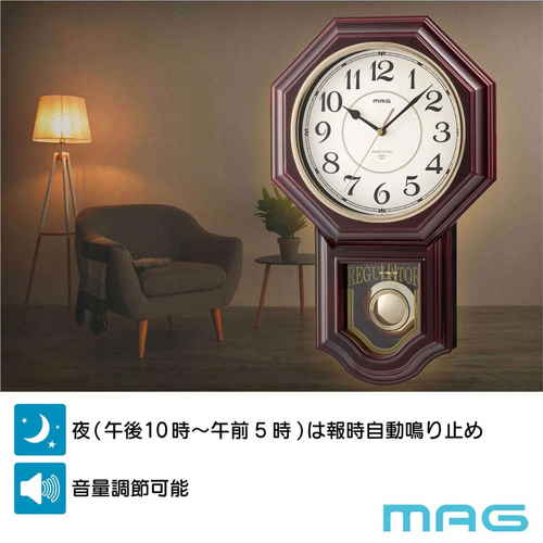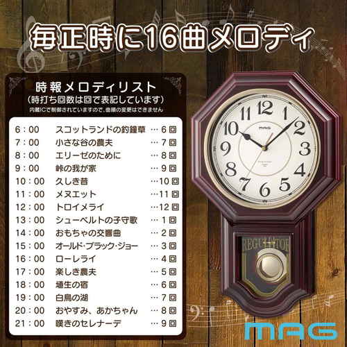 連続秒針、振子、時報(メロディと時打ち)、音量切替、時報自動鳴り止め