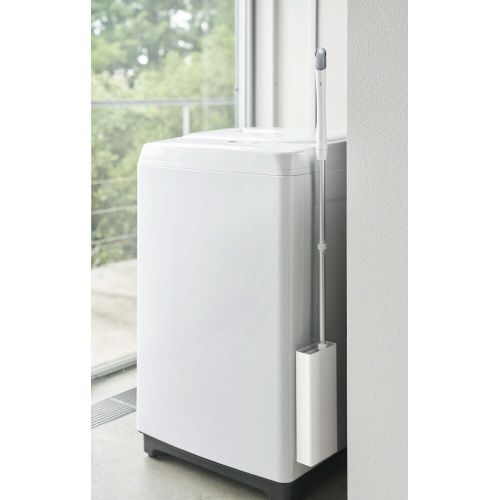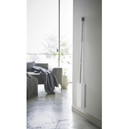 強力マグネットで冷蔵庫・洗濯機の側面などに取り付けるだけ。壁面に固定されるので出し入れがスムーズ。付属の木ネジで簡単取り付け。フローリングワイパーをスリムに立てて収納。