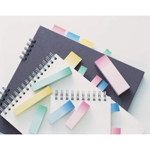 くり返し貼ったりはがしたりできるポストイット通常粘着製品です。上品なグラデーションカラー。一行メモ、見出しに便利なサイズ。資源の有効利用を考え、古紙パルプ配合率100%の再生紙を使用しています。