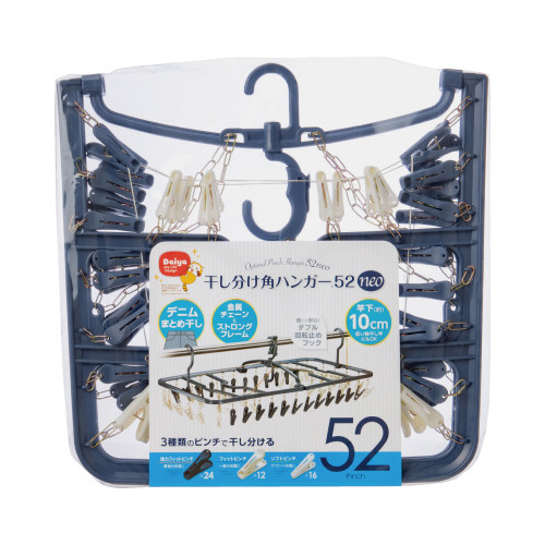 52個ピンチの大型モデル。3種類ピンチで洗濯物を干し分け。ストッパーと左右フックでハンガーの横ズレと回転を押えます。竿下約10cm薄型設計で低い物干しにもお勧め。