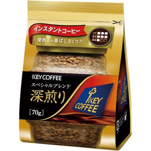 キーコーヒーインスタントコーヒースペシャルブレンド深煎りの便利な詰め替え用です。深煎りコーヒーによる苦みが特徴です。