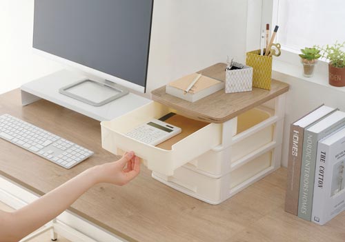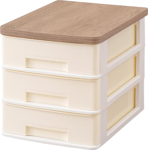 ●材質/天板:プリント紙化粧パーティクルボード、本体:ポリプロピレン、引出:スチロール樹脂