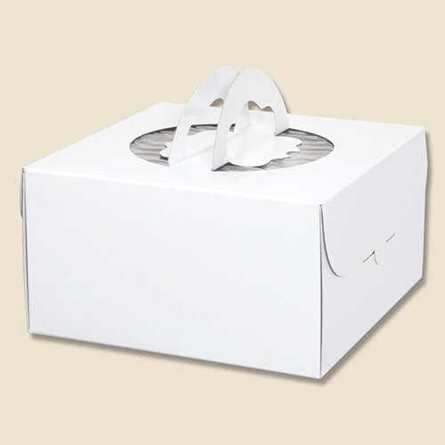 使いやすいデコレーションケーキ用の手提げ箱。サイズは横250×縦250×高135mmです。