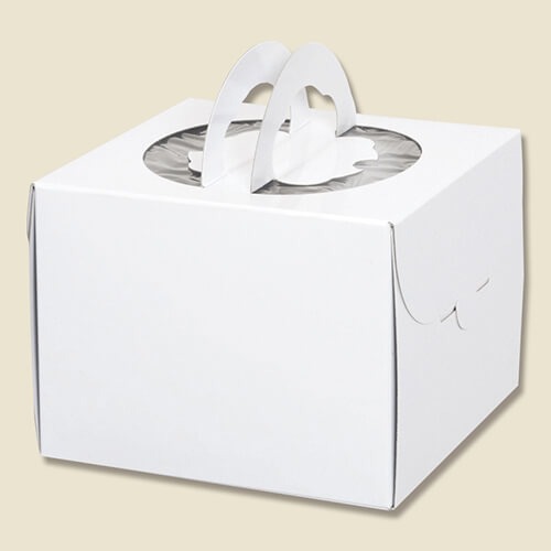 使いやすいデコレーションケーキ用の手提げ箱。サイズは横150×縦150×高115mmです。