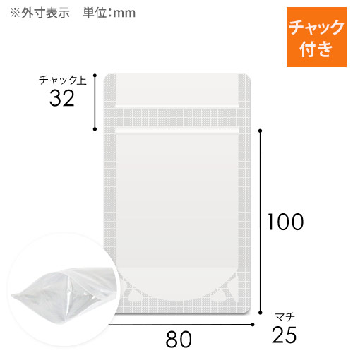 | サイズ | 袋巾80×長さ100+チャック上32×底マチ25mm(ガゼット巾) |