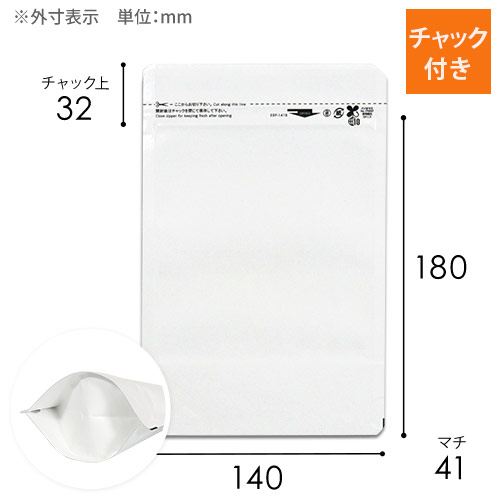 開封用のチャックが付いた140×212(180)×41mmで白色のラミネート袋(チャック袋)。安定して封入・陳列できるスタンドパックです。