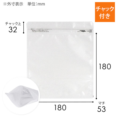 | サイズ | 袋巾180×長さ180+チャック上32×底マチ53mm(ガゼット巾) |