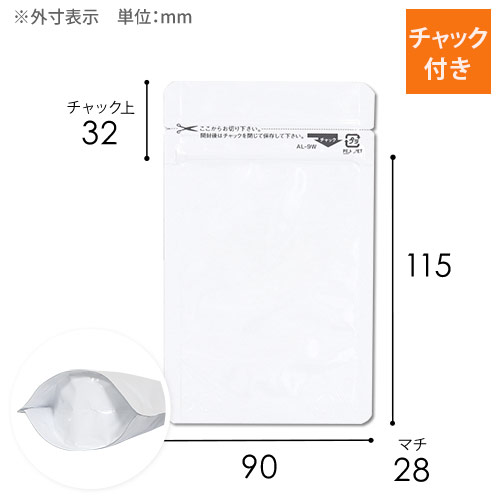 開封用のチャックが付いた90×147(115)×28mmで白色のラミネート袋(チャック袋)。安定して封入・陳列できるスタンドパックです。