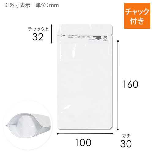 開封用のチャックが付いた100×192(160)×30mmで白色のラミネート袋(チャック袋)。安定して封入・陳列できるスタンドパックです。