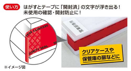 はがすとテープに開封済の文字が浮き出る開封防止テープ。はがした跡には何も残りません。お好みの長さにカットできます。表面には油性ペンなどで書き込み可能。機器などの無断使用や、扉やフタの開封防止に!
