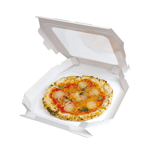 12インチのピザが入る大きさのピザ用ボックス。イタリア語で「美味しい」という意味の「BUONO」という言葉が印刷されています。窓付きでトッピングがきれいに見えるため、店頭販売用のパッケージにおすすめです。