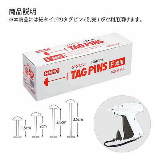 試し打ち用のピンを付属したタグピン用のタグガンです。デリケートな商品におすすめの細(F)タイプ。●セット内容:タグガン・お試し打ち用タグピン(20mmピン200本、25mmピン200本)