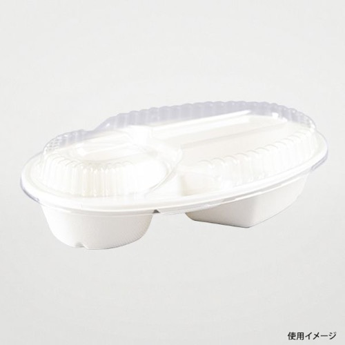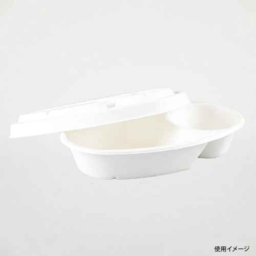 清潔感あるホワイトを基調としています。内面のPLAフィルム加工でお米の貼り付きを抑制。耐油耐水性があり電子レンジ対応、テイクアウトや店舗販売用のカレーにぴったりです。蓋は本体と同素材のものと中身が見える透明タイプの2種類。容量:ごはん200g/カレー100g