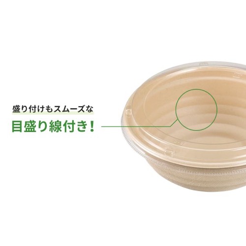 シンプルなデザインで、さまざまなメニューと相性抜群。内面に目盛り線があり、盛り付けが簡単。内面のPLAフィルム加工でお米の貼り付きを抑制、耐油耐水性、電子レンジ対応。テイクアウトや仕出し弁当用の容器にピッタリです