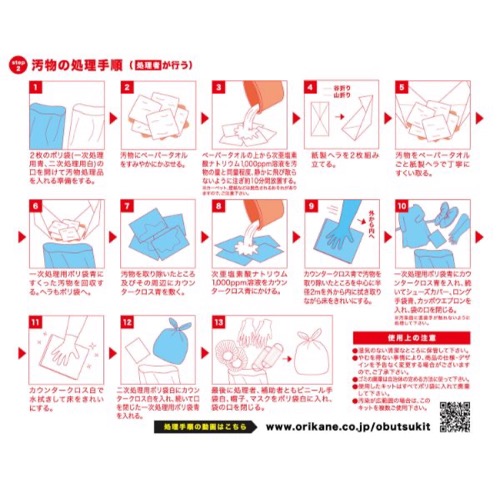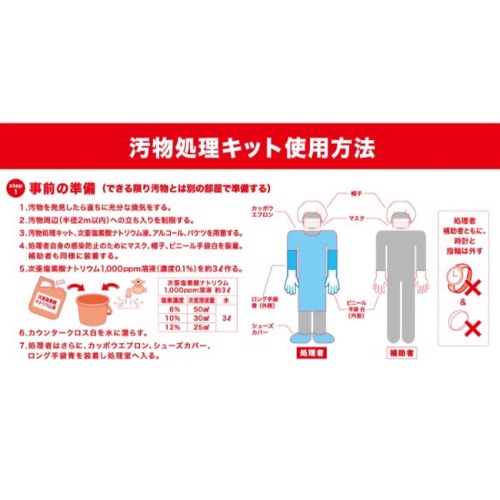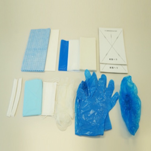 初めてでも簡単・安心です!【セット内容】サージカルマスク2枚、使い捨て帽子2枚、カッポウエプロン1枚、使い捨て手袋 白 2双(4枚)、ロング手袋青1双(2枚)、シューズカバー1足(2枚)、カウンタークロス一次処理用青6枚、カウンタークロス二次処理用白3枚、ポリ袋一次処理用青1枚、ポリ袋二次処理用白1枚、ペーパータオル50枚、紙製ヘラ2枚。