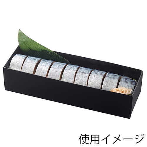 組立式の黒い寿司折箱です。表面にはフィルム加工をしており、内側も黒一色で高級感があります。鯖寿司・穴子寿司などの押し寿司・太巻き寿司、個包装の焼き菓子やパウンドケーキなどを入れても。
