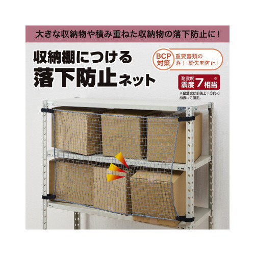オープンラックに取り付けて震災時の収納物の落下を防止するネットです。頻繁には動かさない防災備蓄品、保管義務のある書類や貯蔵品の収蔵庫にもおすすめです。震度7相当に対応しています。