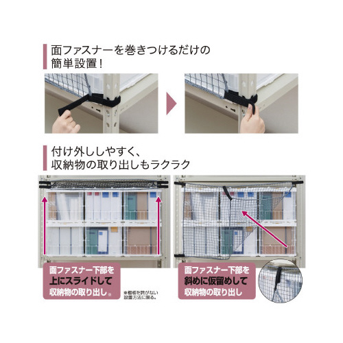 オープンラックに取り付けて震災時の収納物の落下を防止するネットです。頻繁には動かさない防災備蓄品、保管義務のある書類や貯蔵品の収蔵庫にもおすすめです。震度7相当に対応しています。
