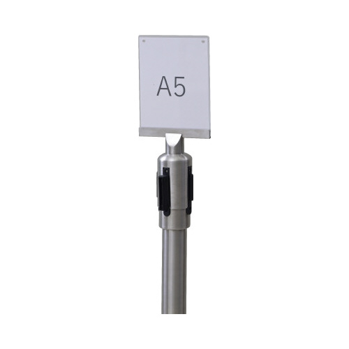 ベルトパーティションの上部に取り付け可能なA5サイズの案内板。ポールの上から被せるだけなので、好みの方向へ向きを変更可能。