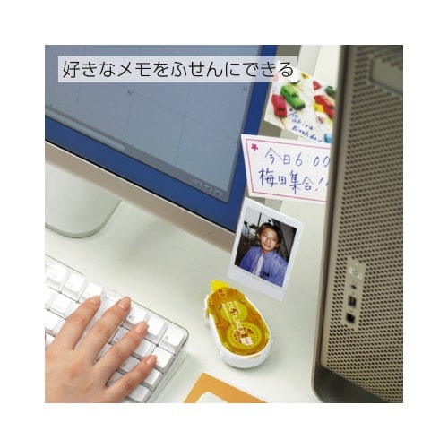 弱粘着だから、気軽に仮止めできる、貼ってはがせるタイプのテープのりです。メモや写真の裏にさっと引いて、ふせん代わりにできます!