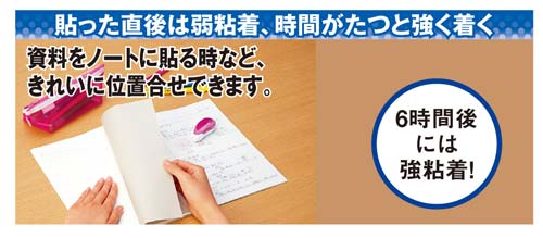 貼った直後は弱粘着、時間がたつと強く付く。資料をノートに貼る時など、しわにならずに、きれいに位置合せできます。