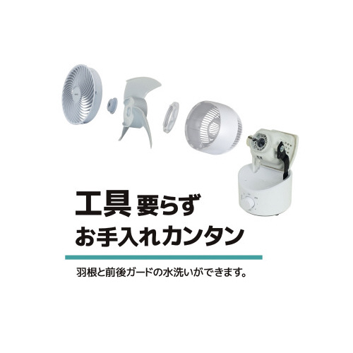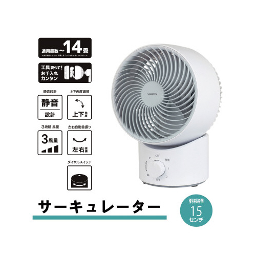 羽根径15cmの首振りサーキュレーター。工具不要でガードと羽根を取り外しでき丸洗い可能。適用畳数-14畳。ダイヤルスイッチで操作可能。