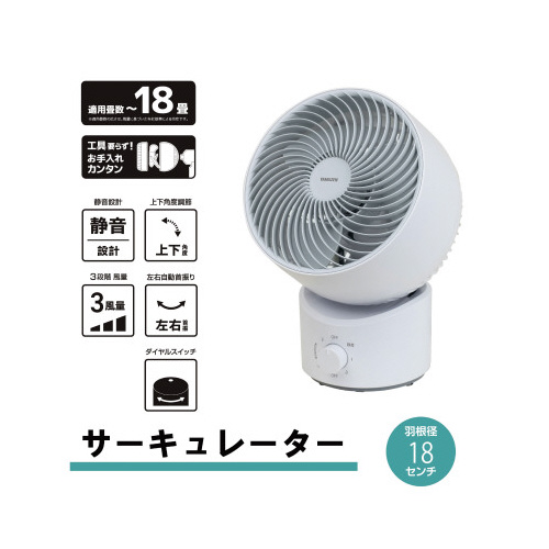 羽根径18cmの首振りサーキュレーター。工具不要でガードと羽根を取り外しでき丸洗い可能。適用畳数-18畳。ダイヤルスイッチで操作可能。
