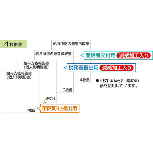 マイナンバー記載に対応した、ドットプリンタ用の源泉徴収票です。税務署提出用、受給者交付用のマイナンバー記載欄のうち、記載しない欄は減感加工により複写されません。