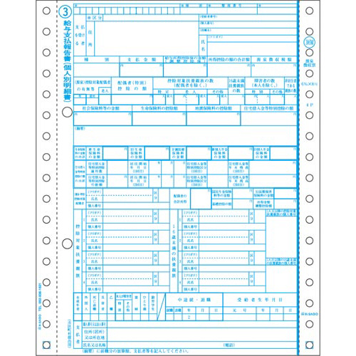 マイナンバー記載に対応した、ドットプリンタ用の源泉徴収票です。税務署提出用、受給者交付用のマイナンバー記載欄のうち、記載しない欄は減感加工により複写されません。