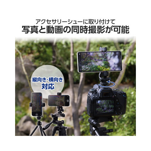 写真と動画の同時撮影が可能!小型・軽量設計でコンパクトなカメラマウント。一眼レフカメラの上部にスマートフォンを取り付けられ、写真撮影だけでは撮り逃してしまう動きのあるシーンも動画撮影でしっかり記憶。