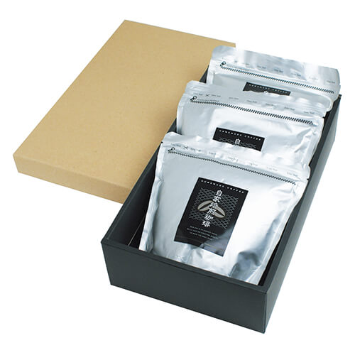 サイズが170×310×90mmのコーヒー用ギフトパッケージ。アルミスタンドパック3袋にちょうど良い大きさとなっています。コーヒーのギフトにいかがでしょうか。