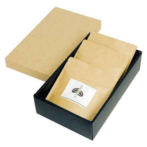 サイズが265×150×80mmのコーヒー用ギフトパッケージ。100gのアルミスタンドパック×3袋にちょうど良い大きさとなっています。コーヒーのギフト箱にいかがでしょうか。