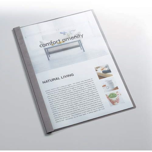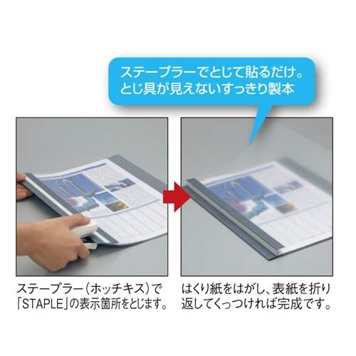 製本テープがない簡易タイプのレポートメーカー。背がきれいに仕上がるので提出用に便利なステープラーとじタイプ。オモテ:透明PP、ウラ:不透明の紙製タイプです。