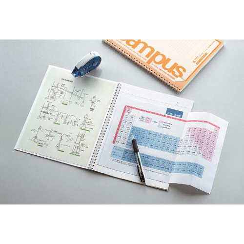 キャンパスツインリングノート。B5サイズの資料が貼れてはみ出さない新規格ノート。四隅にあるLマークを目印にプリントが貼れます。