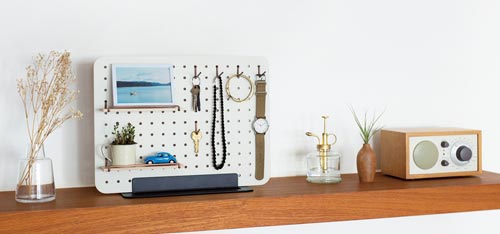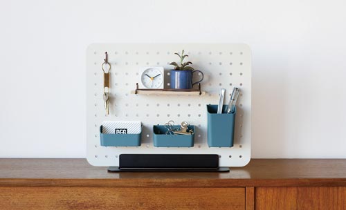 「PEGGY」はペグボードを使った卓上収納。工具不要で、組み立ても簡単。様々なパーツを取り付けることができるので、好みの収納を手軽にお楽しみいただけます。