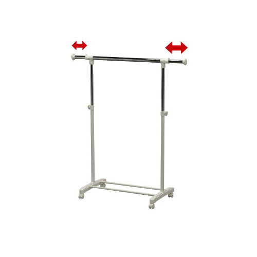 上下に伸縮でき、ハンガー部も伸縮できるパイプハンガーです。移動に便利なキャスター付きです。