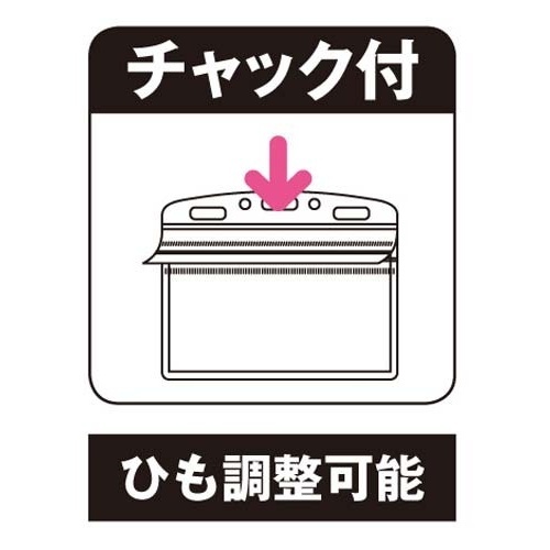 チャック付きでカードの落下を防ぐ!フックパーツを採用しているので、表示面が裏返りにくい。1本のストラップに違うカードや鍵など、複数の物を吊り下げ可能。
