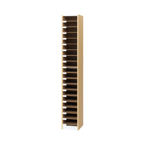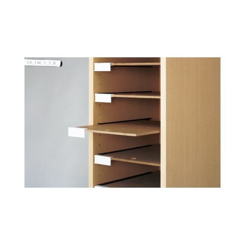 追加用のオプション棚板。取っ手穴付きで取り出しやすいスライド式。分類に便利なネームプレート付きです。