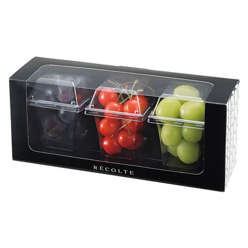 サイズが身276×80×117(カップ62.7×71+31)mmのフルーツ用ギフトパッケージ。カットフルーツ、ドライフルーツやナッツ類にちょうど良い大きさとなっています。さまざまな果物類のパッケージ、ギフト包装にいかがでしょうか。