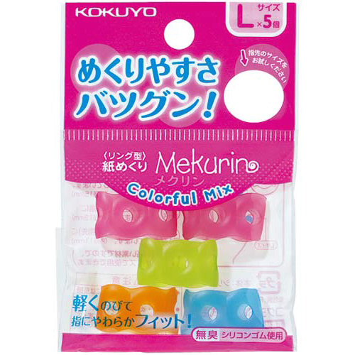 親指用として使えるLサイズです。人気の4色をカラーミックス。柔らかく、伸縮性に優れたシリコンゴム素材なので、指にしっかりフィットし、紙のめくりやすさも抜群です。