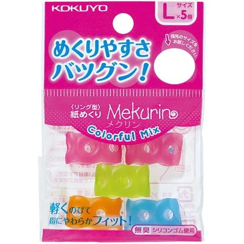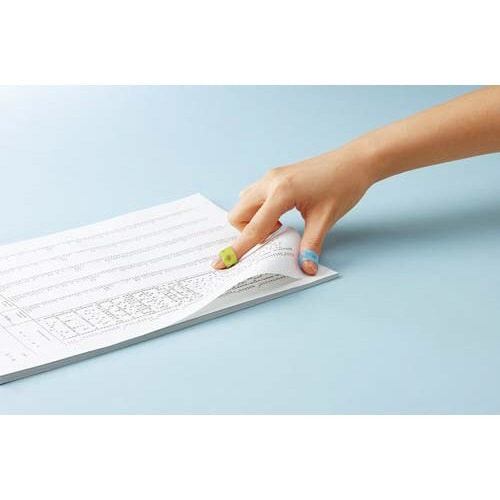 親指用として使えるLサイズです。人気の4色をカラーミックス。柔らかく、伸縮性に優れたシリコンゴム素材なので、指にしっかりフィットし、紙のめくりやすさも抜群です。