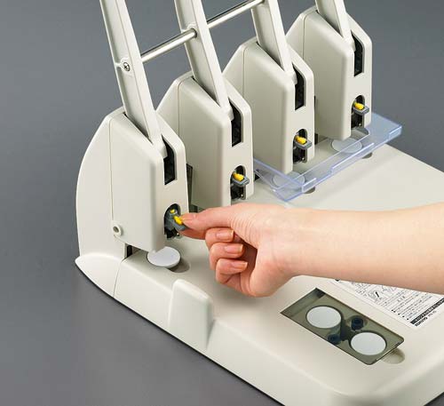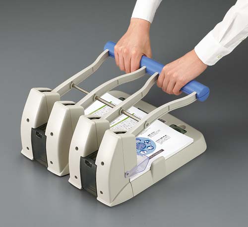 大量の書類を一気にパンチできる、超強力4穴パンチ。パンチの刃は、取り付け取り外しが簡単なワンタッチ交換式です。