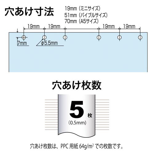 バイブルサイズ、ミニサイズ、A5サイズの3種類のシステム手帳に対応した移動式パンチです。内側の移動本体をスライドさせると3種類のシステム手帳に対応出来ます。