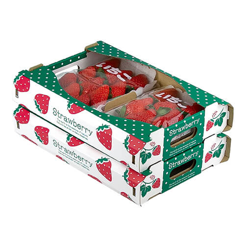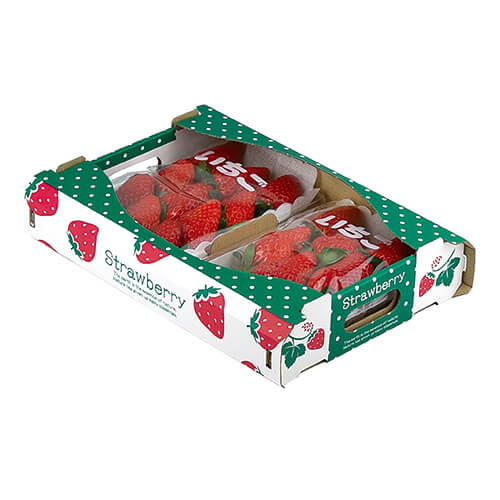 サイズが265×200×55mmのフルーツ用ギフトパッケージ。イチゴ平250g用トレー×2パックにちょうど良い大きさとなっています。イチゴのパッケージ、ギフト包装にいかがでしょうか。