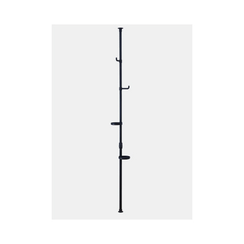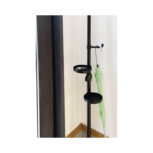 設置場所を選ばない突っ張り方式、衣服を掛けるフック2箇所、アクセサリーや植物を置けるトレー2箇所付き