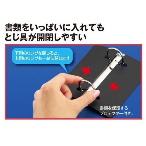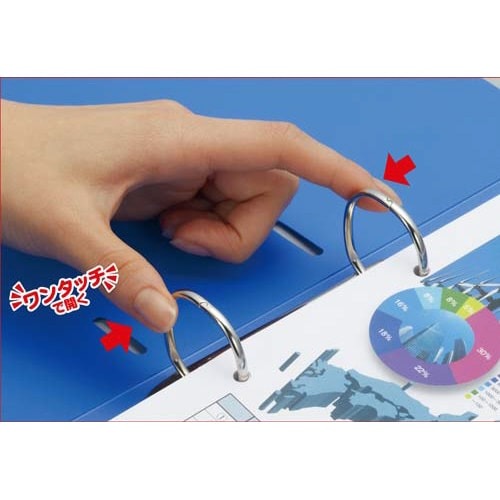 閲覧や抜き差しする頻度が多い書類に。片手で軽くつまむだけでラクに開けられる!下側のリングを閉じると、上側のリングも一緒に閉じます。収容枚数はそのままでスリムに!不透明表紙タイプはこちら。