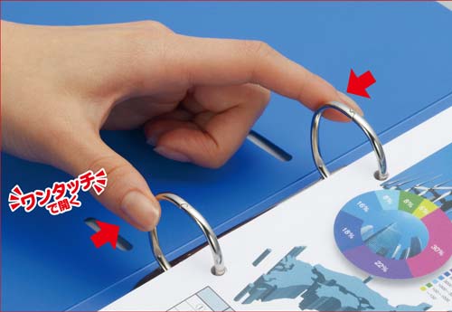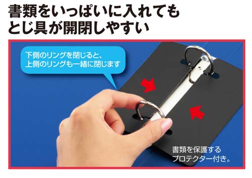 閲覧や抜き差しする頻度が多い書類に。片手で軽くつまむだけでラクに開けられる!下側のリングを閉じると、上側のリングも一緒に閉じます。収容枚数はそのままでスリムに!不透明表紙タイプはこちら。