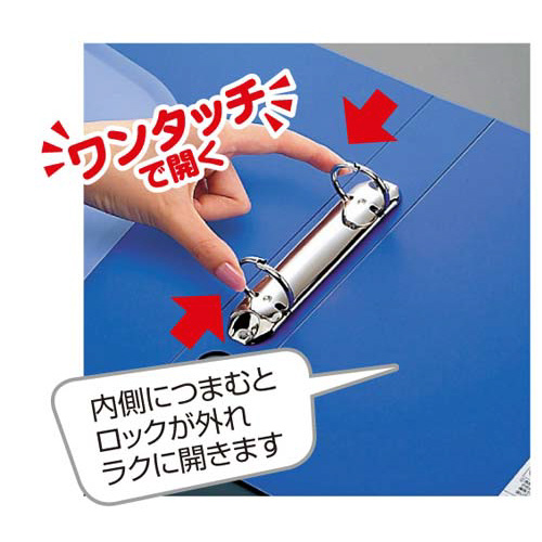 ワンタッチで開くリングを採用。リングを内側につまむとロックが外れラクに開きます。棚から取り出しやすいフィンガーホール付き。
